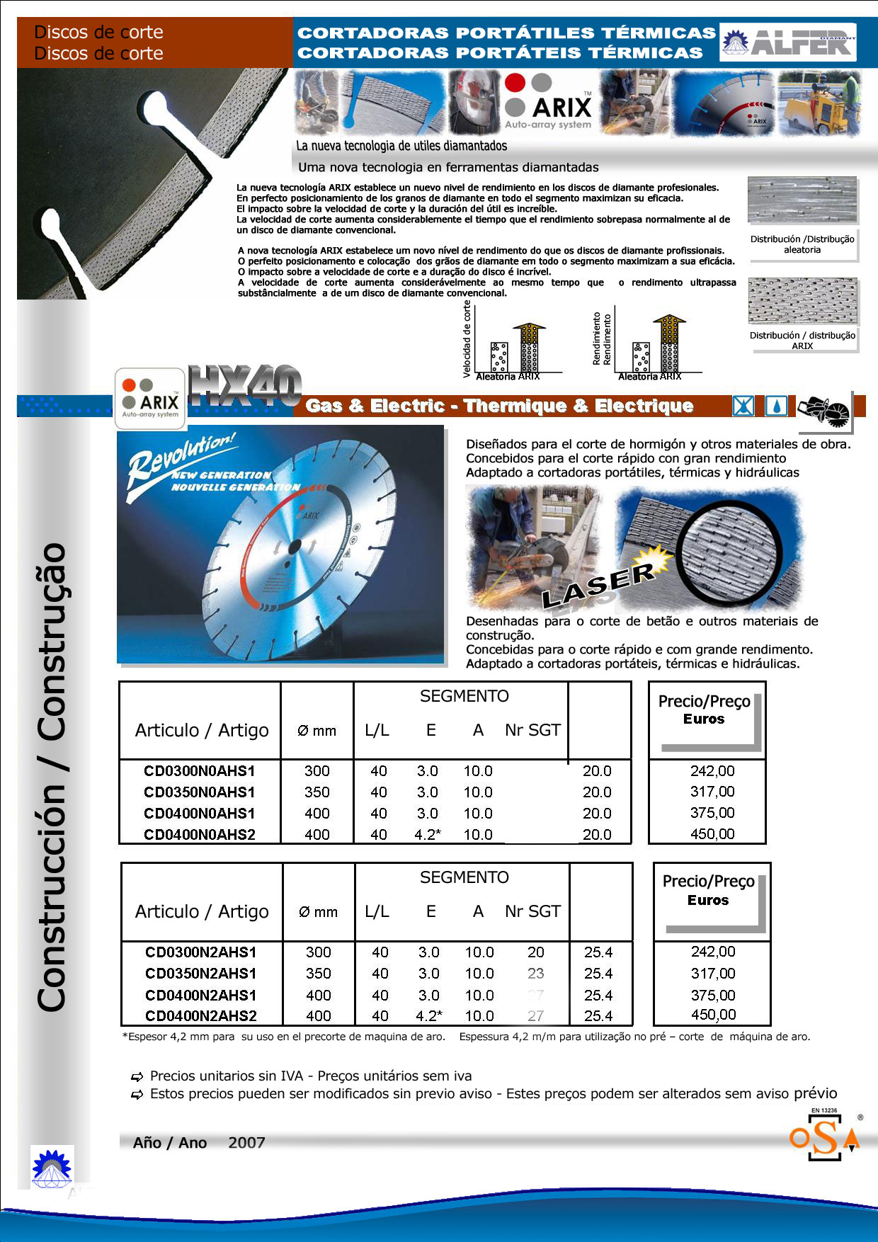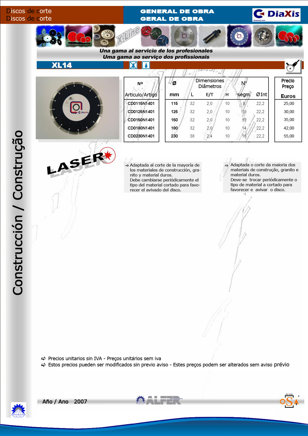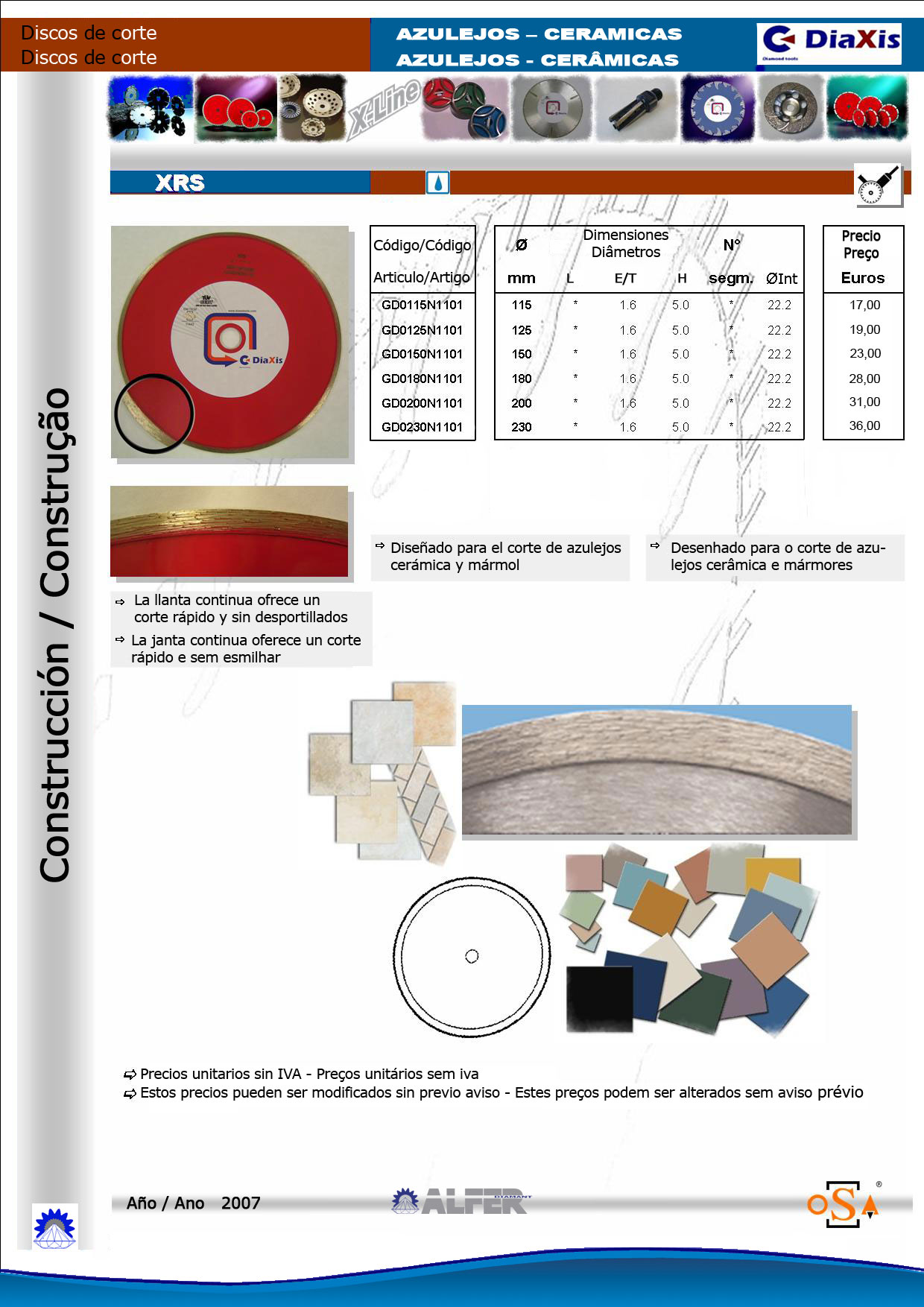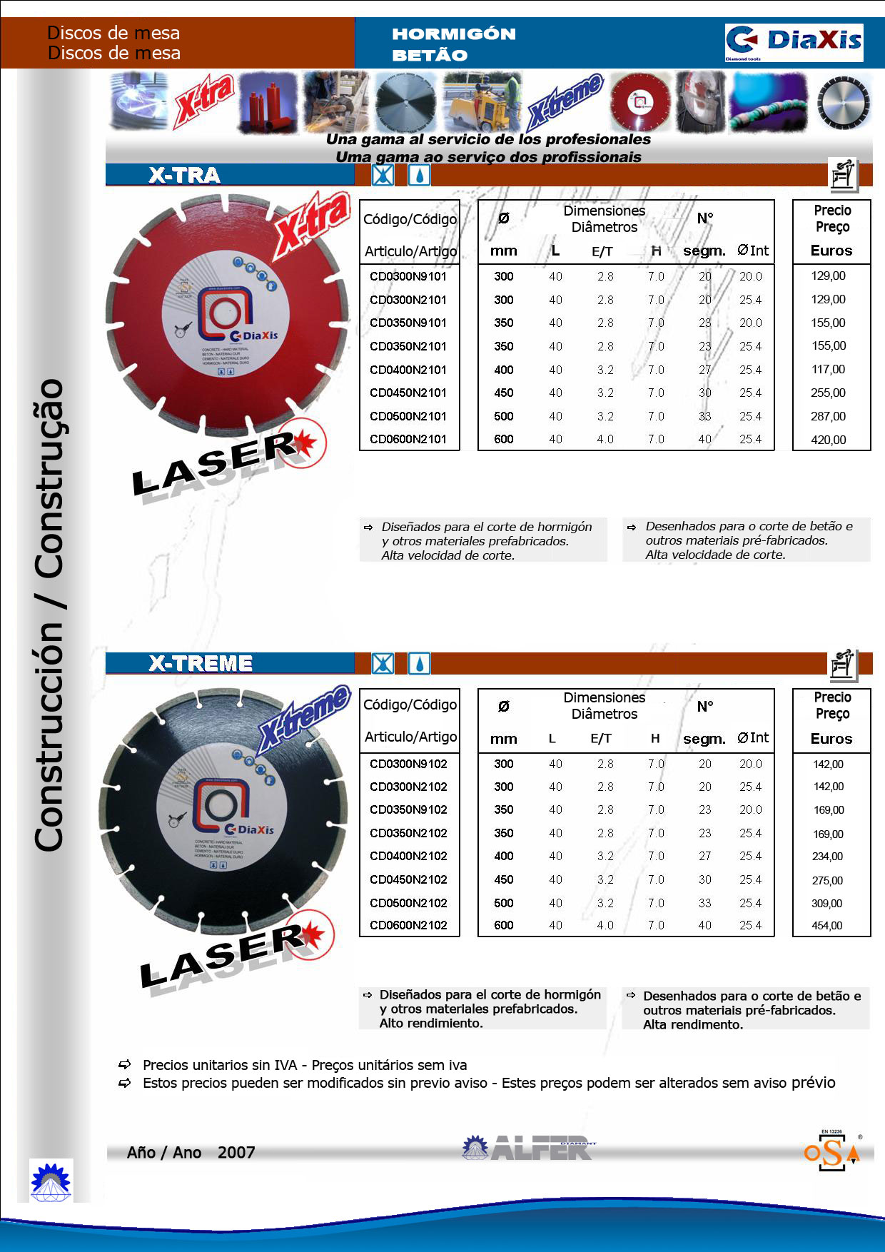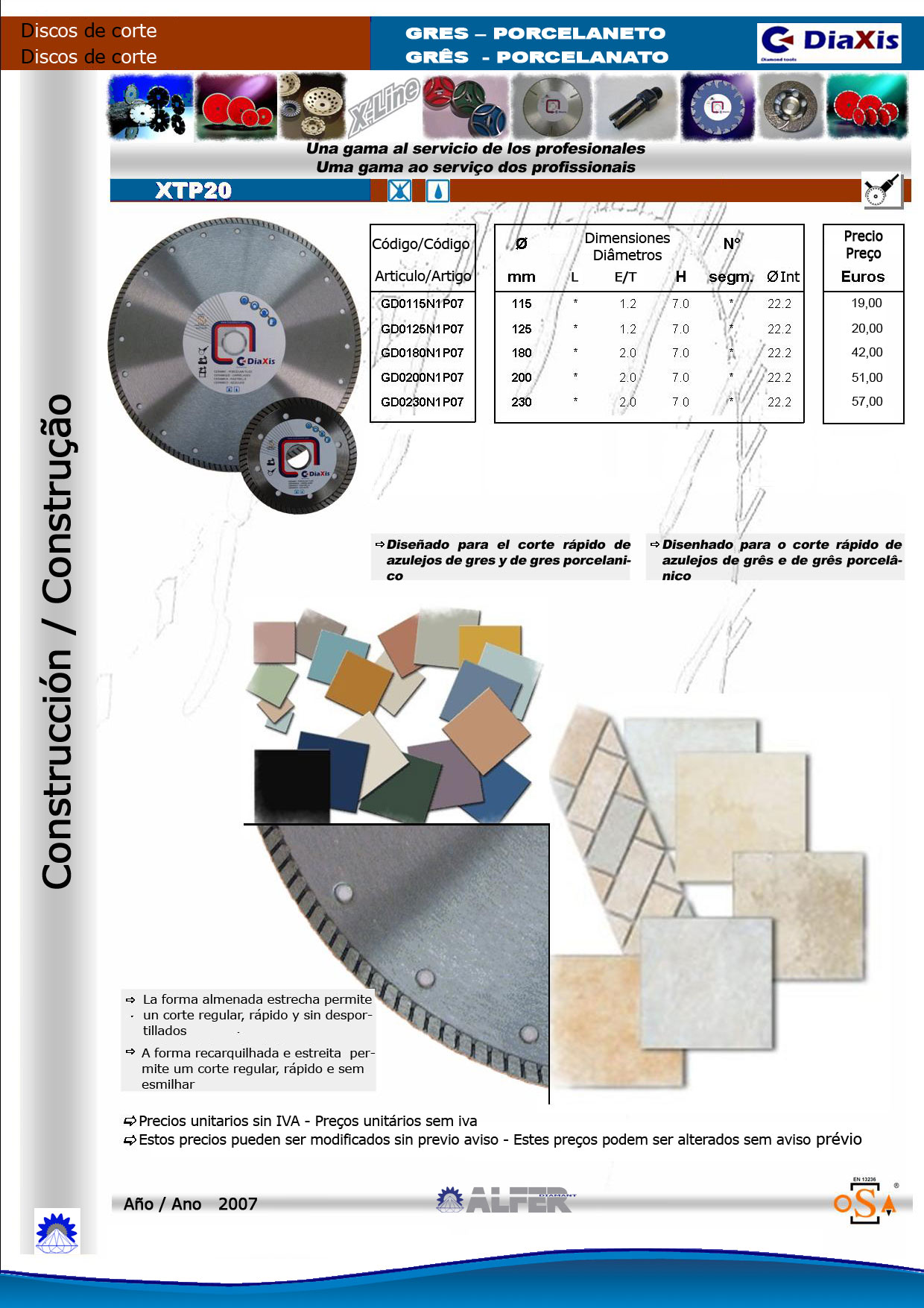DISCOS DE MESA Diseñados para el corte en maquinas de mesa de obra: XRS: Especialmente diseñado para el corte de azulejos fabricados en llanta continua para reducir al máximo el desportillado del material cortado. XTP20: Diseñados para el corte de gres y porcelanato ofrece mediante la llanta almenada una gran rapidez de corte al tiempo que reduce el riesgo de desportillados. Este disco puede ser usado tanto en seco como en húmedo. XL 14: Diseñado para el corte general de obra se adapta bien al corte de una gran gama de materiales. Tienen una altura de segmento de 10mm para ofrecer un gran rendimiento y una soldadura láser permitiendo ser usado tanto en seco como en húmedo. HX40: Disco de la gama de cortadoras térmicas que puede ser usado para dado su diseño en cortadoras de mesa para el corte de granitos. X-TRA HORMIGON: Discos especialmente diseñados para el corte de ladrillos caravista, tejas y bloques de hormigón ofreciendo una buena velocidad de corte. X-TREME HORMIGON: Diseñados para el corte de materiales abrasivos como los refractarios, bloques de hormigón y terrazos revés con un buen rendimiento. |